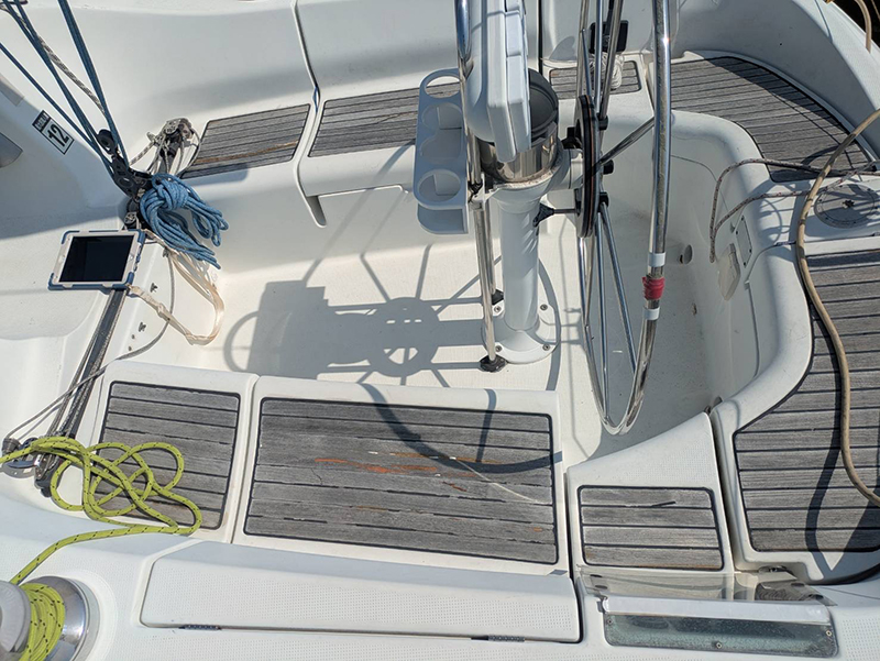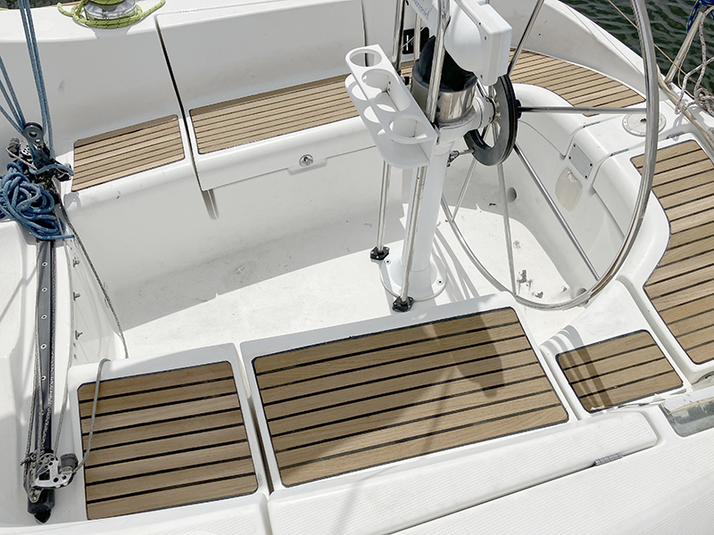 | まず、型取りをし、ある程度で材料を成形し、次に劣化したチークを剥離。 1枚1枚を根気よく張り合わせ、メジを造り、最後は仕上げにシーカーフレックスででコーキング。 工期は10日ほど。 根気のいる作業です。 |