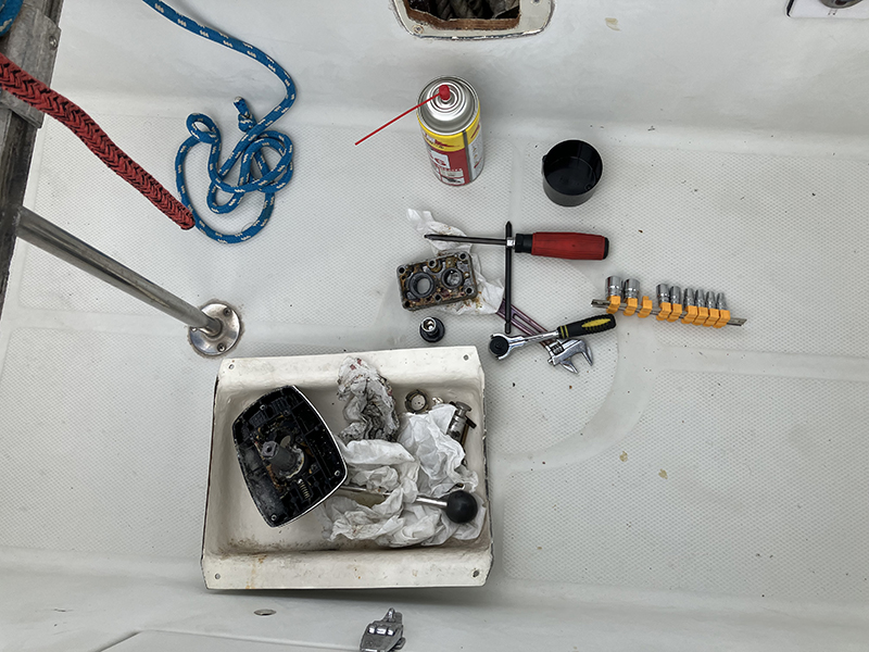 | 7月6日、6月29日のセイリングの後、ドジャーを展開するためにブームを持ち上げたら、グースネックの動きが異様でよく見るとグースネックのピンの割りピンが破損し、抜けてしまっていた。 次に発見したのは、ブームバングのマスト側のブラケットが曲がってしまっており、エンドパーツにクラックが入っていた。 これはセイリング中なのかは原因は不明。 修理対応は1人では不可で、ハーバースタッフさんのチカラを借りることに....。 まずはブラケットの修理とSELDEN(ブームバング)の交換。 戦歴40年にもなると、あらゆる箇所が壊れていく。 |