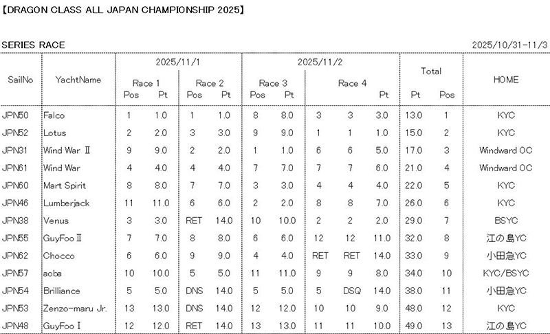 | 10月31日〜11月3日 ドラゴンクラス全日本選手権 |