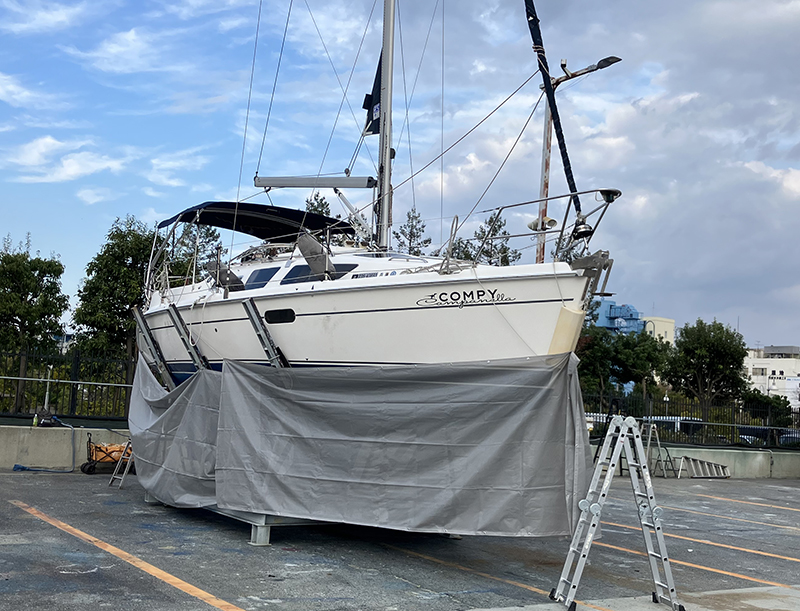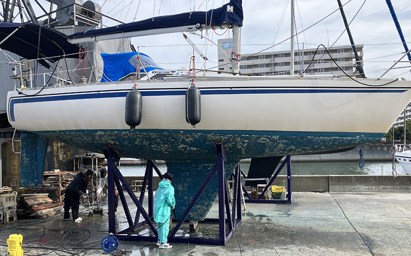 | HUNTER 新西宮YHでの上架。船底整備のための保護ネット。 | |||||||||
