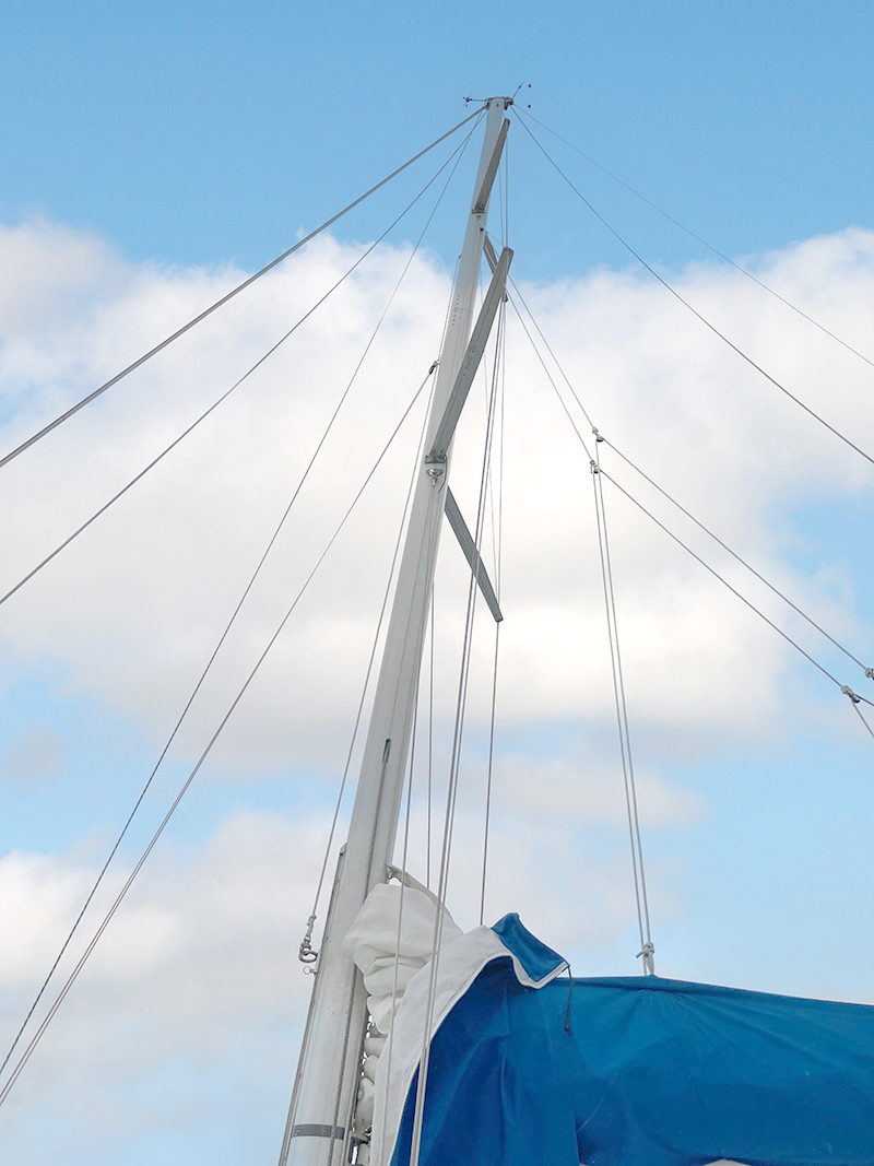 | たまにはマストを眺めてみましょう。 まず、桟橋での確認。 スターン側のブームの上からグルーブを覗いて真っ直ぐならOK。 右舷か左舷側に曲がっていたなら、調整が必要。 S字に曲がっているのもNG。 左右に曲がっている場合は、サイドステイ(リギン)の両舷のリギンアジャスターの割ピンを抜き、上画像のように丈夫なドライバーやモンキーレンチやバイスプライヤーを使って緩めたり、締めたりしながらマスト(グルーブ)が真っ直ぐになるように両舷のサイドステイを調整します。 サイドの調整が出来たら、次は前後のマストの前後の傾きを調整します。 テンションゲージがあれば正確にリギンの張りを調整出来ます。 バウ側に倒れているのはNG。 真っ直ぐかスターン側に倒れているならOKとしましょう。 フォアステイの調整も確認します。 セーリングしながら、ジブセイルを展開した時にフォアステイが極端な円弧になっている場合はフォアステイを締めれば円弧は小さくなりますが、ファーラーなどでフォアステイの調整が難しい場合にはパックステイを引きながらフォアステイ(ジブセイルのラフ側)の円弧を真っ直ぐに近づけるまで調整します。 セイリングしながら、タックを繰り返しリギンを調整していきますが、かなり根気が必要になります。 ここはプロに任せた方が良いかも知れません。 クルージングヨットでもマスト調整は大切です。 調整すれば走りが変わり、速くなります。 最後に必ず割ピンを戻してテープなどで割ピンでセイルにキズが付かないように保護。 ワイヤーのほつれやサビがあれば交換の時期。 マストに登る機会があれば、マストやスプレッダーに腐食がないかをチェックすることも重要です。 |