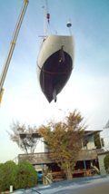 25tクレーンをチャーターし、海上係留のキャバリアをトラックに積込む。