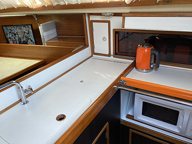 ポンツーンライフ仕様にするため、陸電とキャビン内にAC電源設備。ポット、レンジとマリンクーラーを設置。
